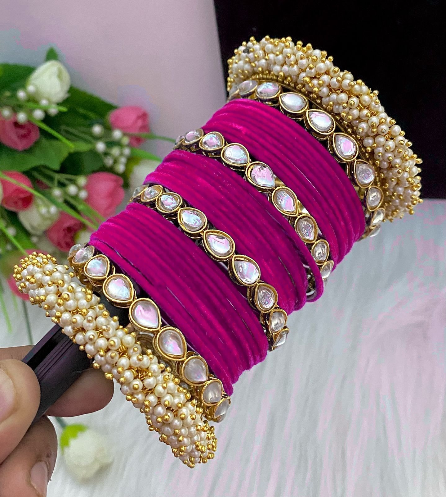 Velvet Bangles with Kundan and Pearl Kada Set
