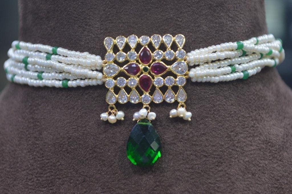 Choker as well as studded with cubic zirconia white,red,green stones, pendant green and white beads. 14 carat gold weighing .960 gram.