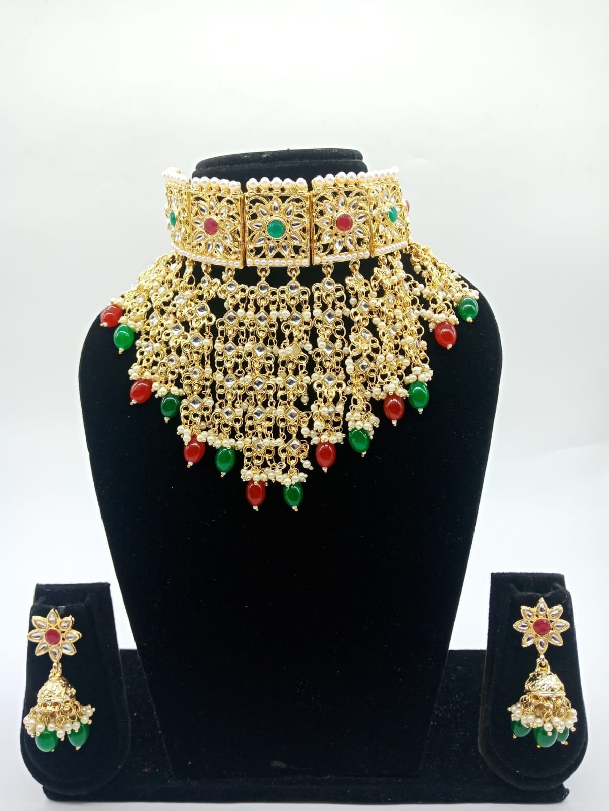 Rajputi Style Gold Plated beautiful 2 color stone choker Set