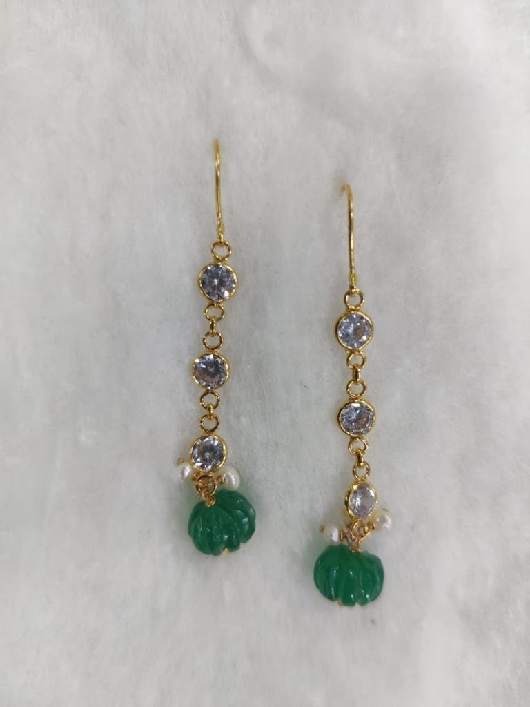 Gold these earrings are 1.75 inches in length. Cubic zirconia stones along with onyx pumpkin and fresh pearls give it a wow factor.