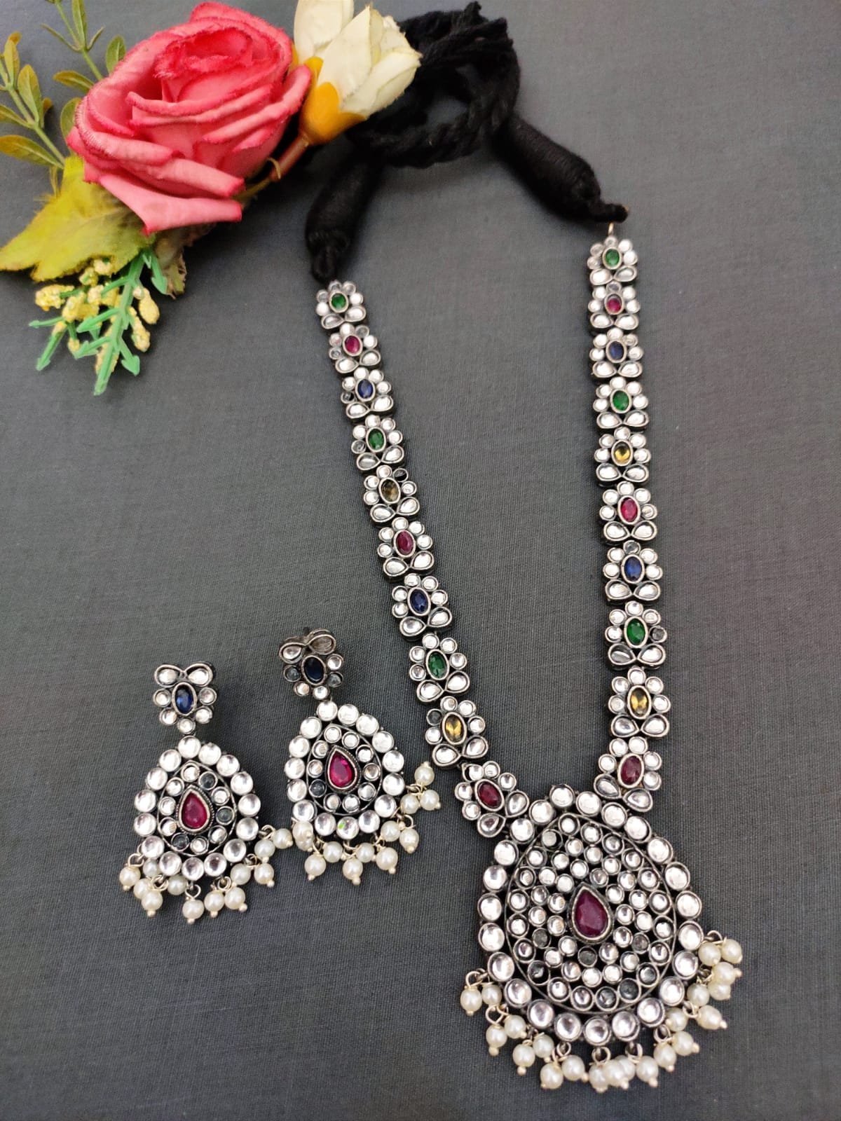 Premium Quality Silver Lookalike Stone Necklace set with Pretty matching Earrings