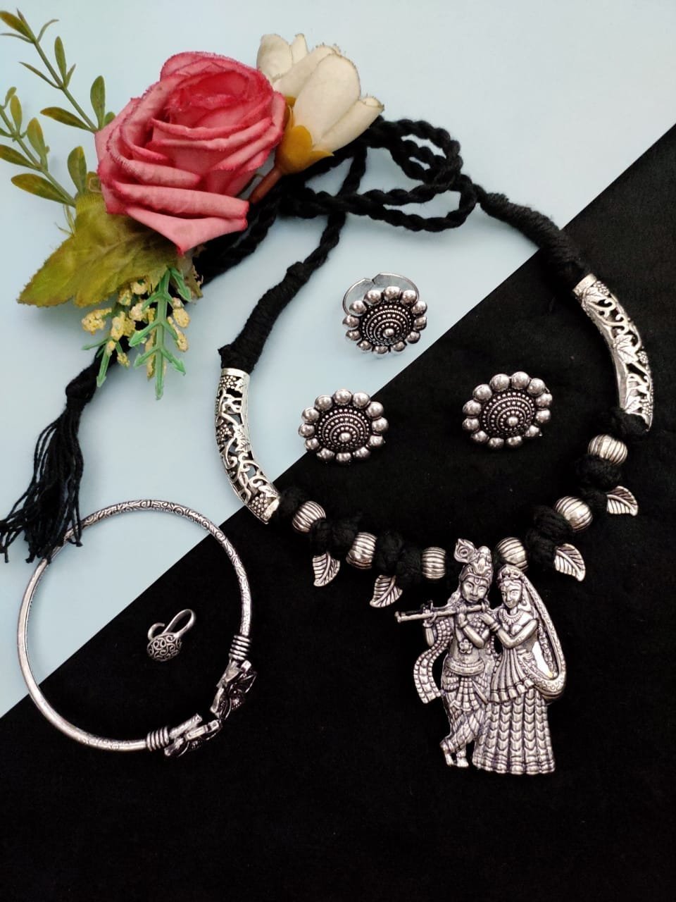 Premium Quality Oxidised Thread Necklace combo set with beautiful Earrings, Ring, Nosepin and Kada