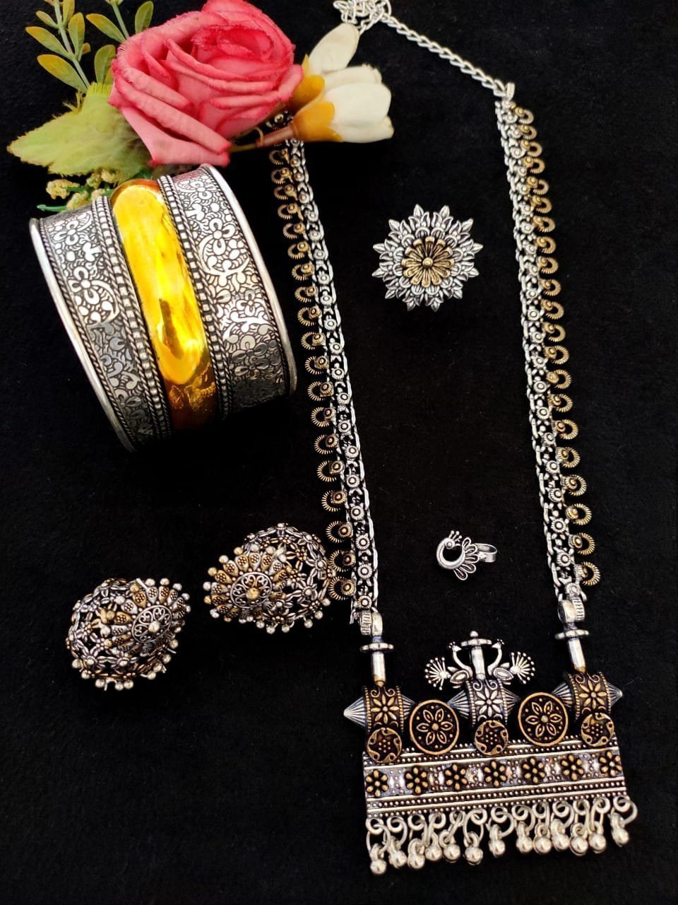 Premium Quality Dual-Tone Long Necklace Combo set with Beautiful Jhumka Earring, Nosepin, Finger Ring and Kada
