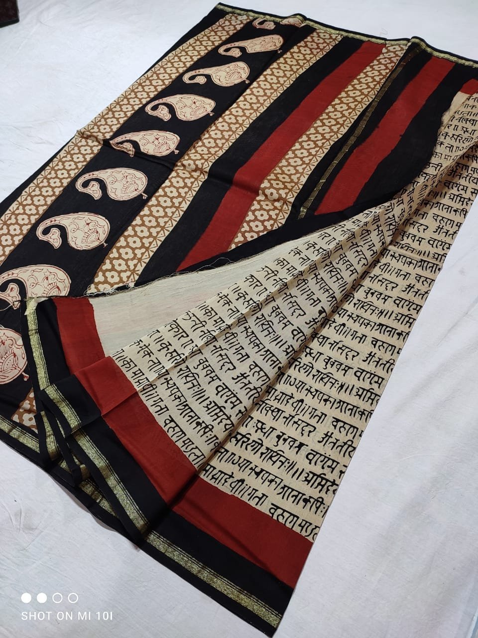 Original Handloom cream chanderi bagru hand block printed cotton silk saree with blouse