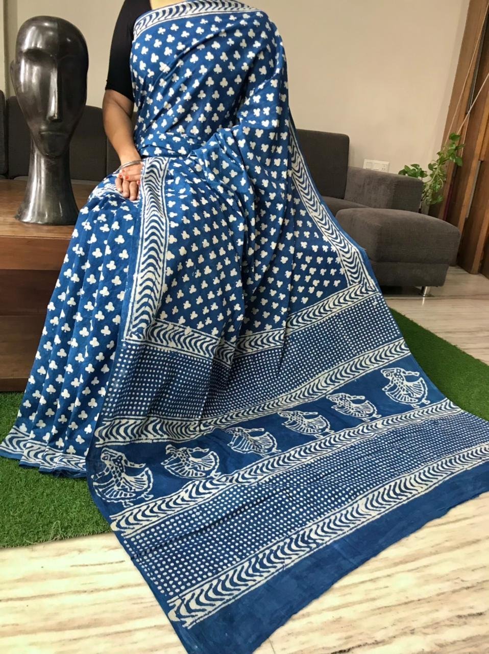 Grayish-blue Beautiful Handblock printed pure cotton mulmul sarees with blouse piece.