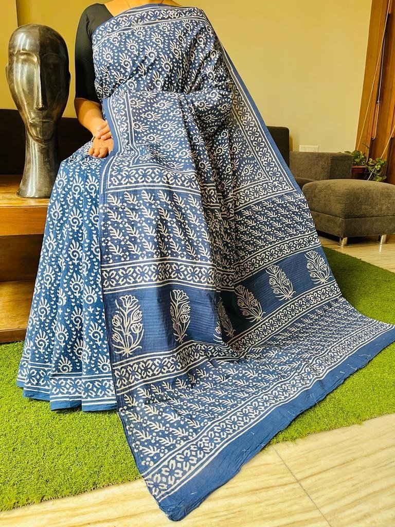 Grayish-blue Beautiful Handblock printed pure cotton mulmul sarees with blouse piece.
